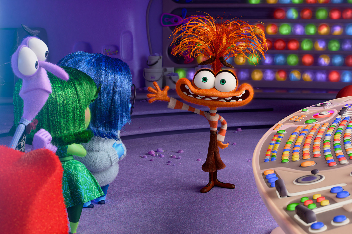 Over time, as Anxiety tries to keep control of Riley, she begins to lose control of herself. Headquarters becoming consumed by a growing electrical storm of racing panic. Unsure as to what to do as she tries everything in her power to make sure that Riley has the best possible future by focusing on every possible negative outcome to show what will happen if they don’t succeed. She becomes frozen to the spot in fear, yet somehow continues rushing around in an increasing frantic surge of frenzied worry.